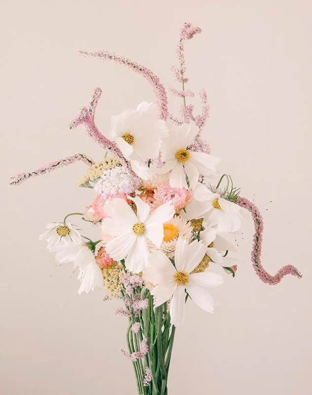Bursts of summer blooms. (Cosmos and zinnia, with sweet pea and yarrow.)